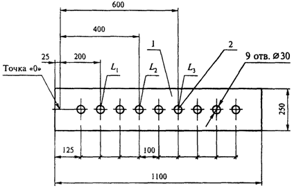 на расстоянии 100, 300, 500, 700, 800 и 900 мм от точки "0".